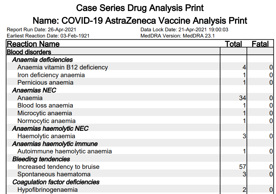 18 세에서 93 세 사이의 여성 120 명과 남성 89 명에서 발생했으며 전체 사망률은 19 %로 41 명이 사망했습니다. 2 차 투여 후 4 건의 사례가보고되었습니다. 뇌 정맥동 혈전증은 84 예 (평균 연령 47 세)에서보고되었으며 123 명은 혈소판 감소증을 동반 한 다른 주요 혈전 색전증 사건 (평균 연령 55 세)이있었습니다. 4 월 21 일까지 영국에서 투여 된 COVID-19 백신 AstraZeneca의 첫 번째 접종 횟수는 2,200 만 명으로 전체 사례 발생률은 백만 회당 9.3입니다.