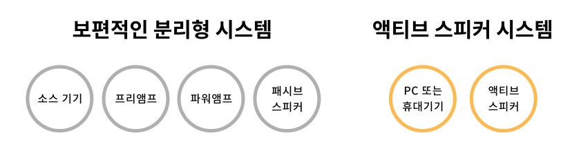 위 그림에서 왼쪽이 패시브 스피커 구성, 오른쪽이 액티브 스피커의 구성이다.
