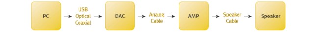 PC -> 소스(APE,WAV,FLAC,MP3등) -> USB케이블 -> DDC(Digital to Digital Converter)-> 동축 혹은 광케이블 -> DAC(digital-to-analog convert) -> 인터케이블 -> 프리앰프 (pre-amplifier) -> 인터케이블 -> 파워 앰프 (power amplifier) -> 스피커선 -> 스피커