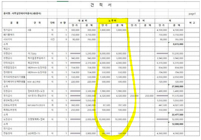 그렇다면, 공사별로 노무비가 따로따로 표시되어 있는게 왜 좋은것인지에 대해 알아보자면 아래 예시를 보아야 한다.
