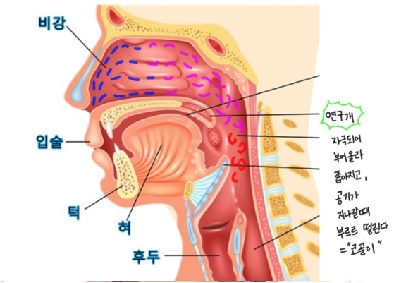 코막힘 현상이 발생하는 부위는 비강인데, 왜 코골이 소리가 나는 연구개와 관련이 있는지 이해해야 한다