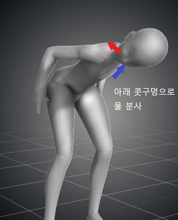 3-2) 고개를 완전히 뒤로 젖힌다.( 완전히 젖히지 않으면 식염수가 바로 식도로 타고 들어가 헛기침 유발)