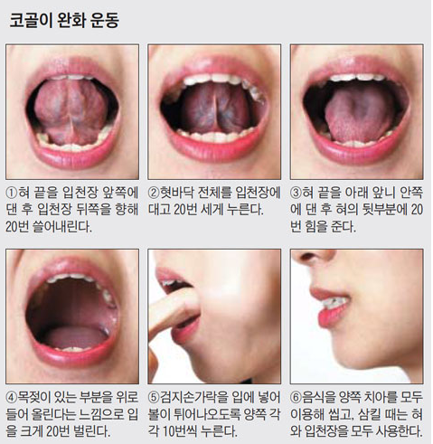 혀 자체가 두껍거나, 혀 근육이 퇴화되어 연구개쪽이 좁아져 코골이를 유발할 수 있으니, 혀 강화 운동을 시행한다. (출처: 조선일보 한희준 기자)