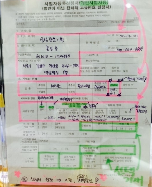 나머지 어려운 부분은 세무서 직원에게 질문하면서 작성하면 사업자등록이 완료된다.