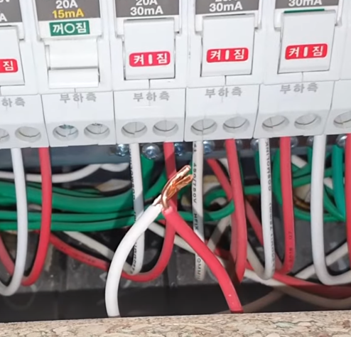 3) 빨강 전선 및 흰 전선이 여러개가 묶여있는 이유는 각각 선이 다른 장소에 있는 콘센트 전선과 연결되어있기 때문입니다.