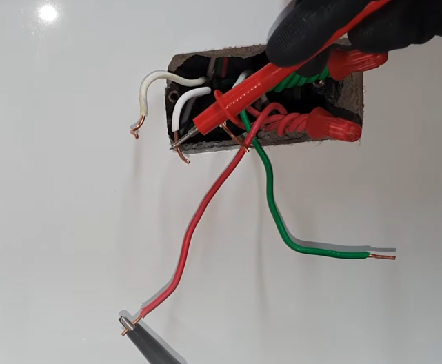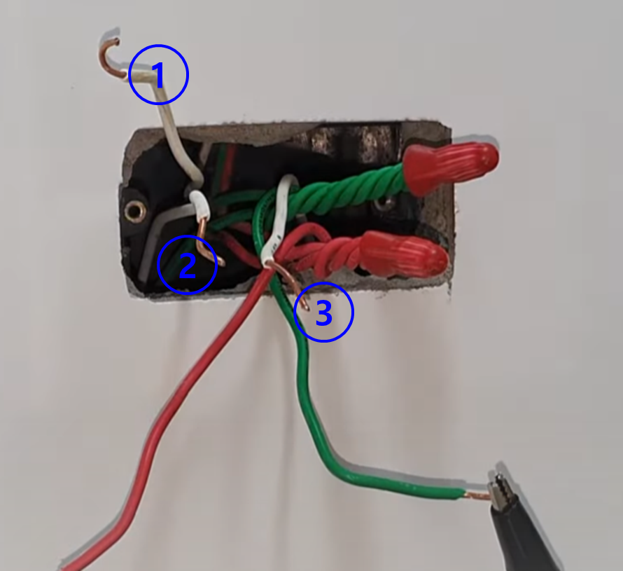 라. 메거테스트기의 흑색 리드봉을 접지선(녹색) 선에 물리고, 적색 리드봉을 1,2,3번 흰색 선에 차례대로 물려본다.