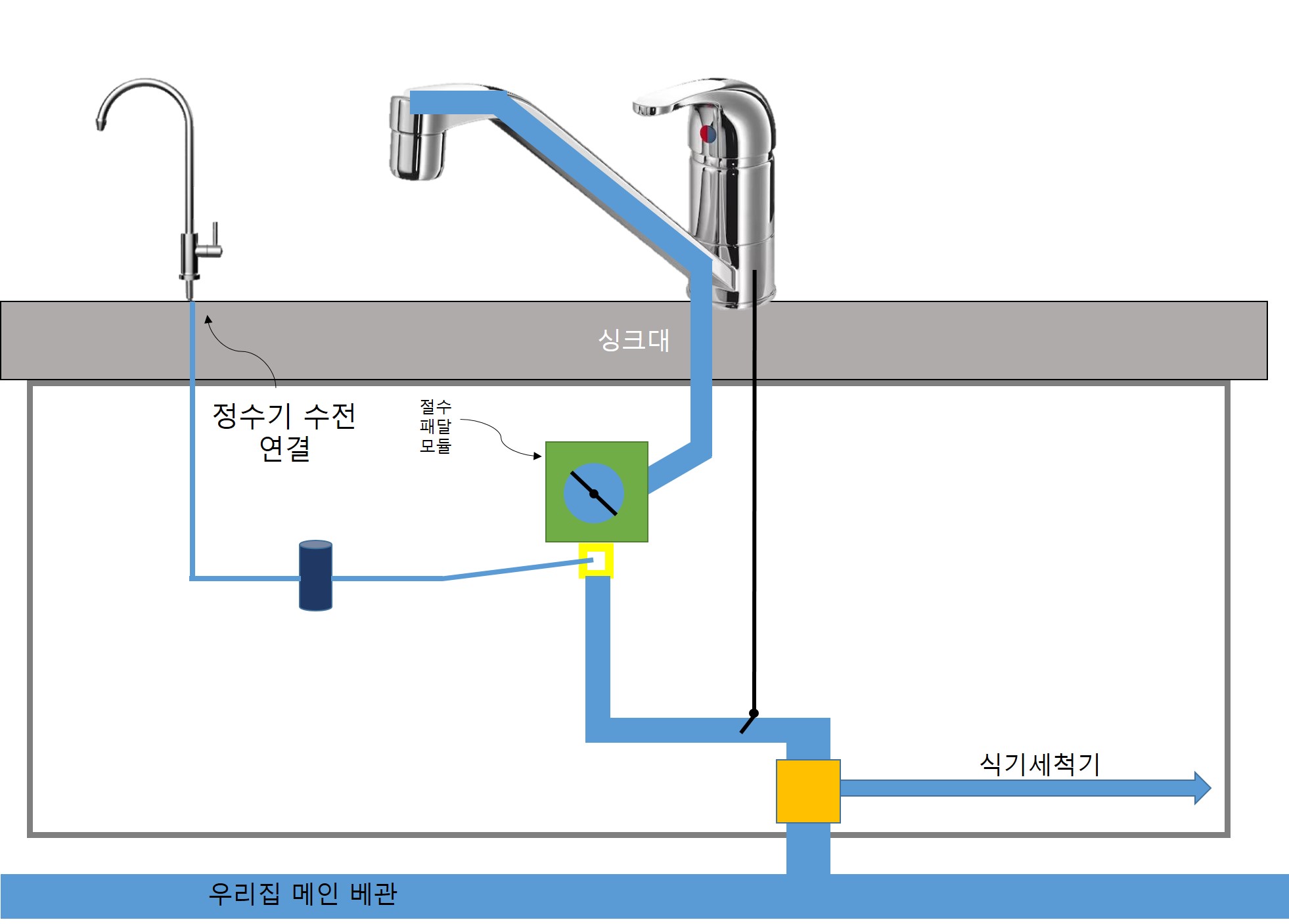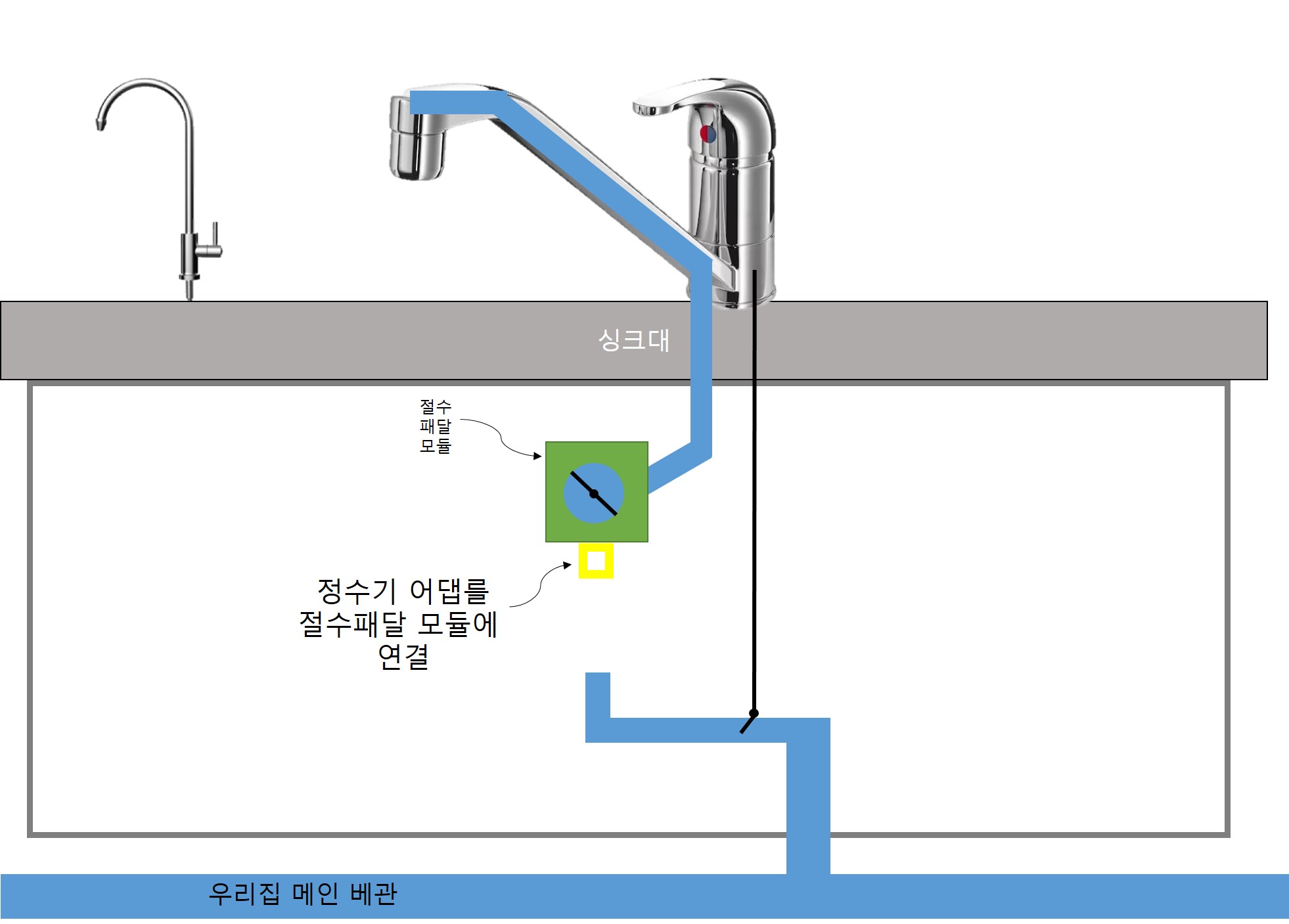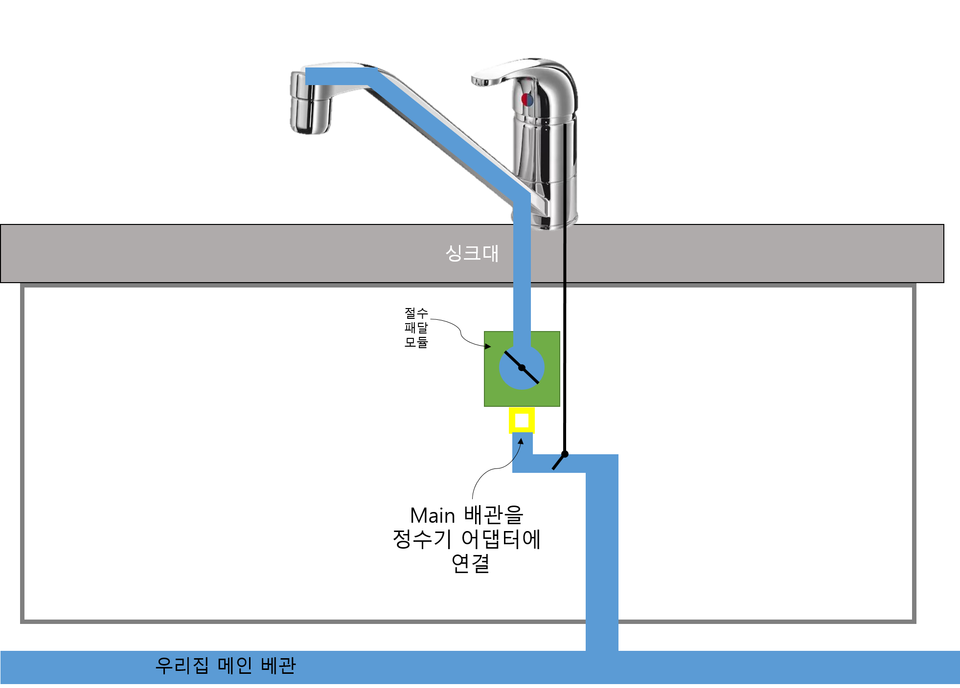 2) 그림 상에 노랑색 박스가 어댑터라는 부품이다. 어댑터가 설치 될 공간이 싱크대 아래에 있는지 확인해야한다