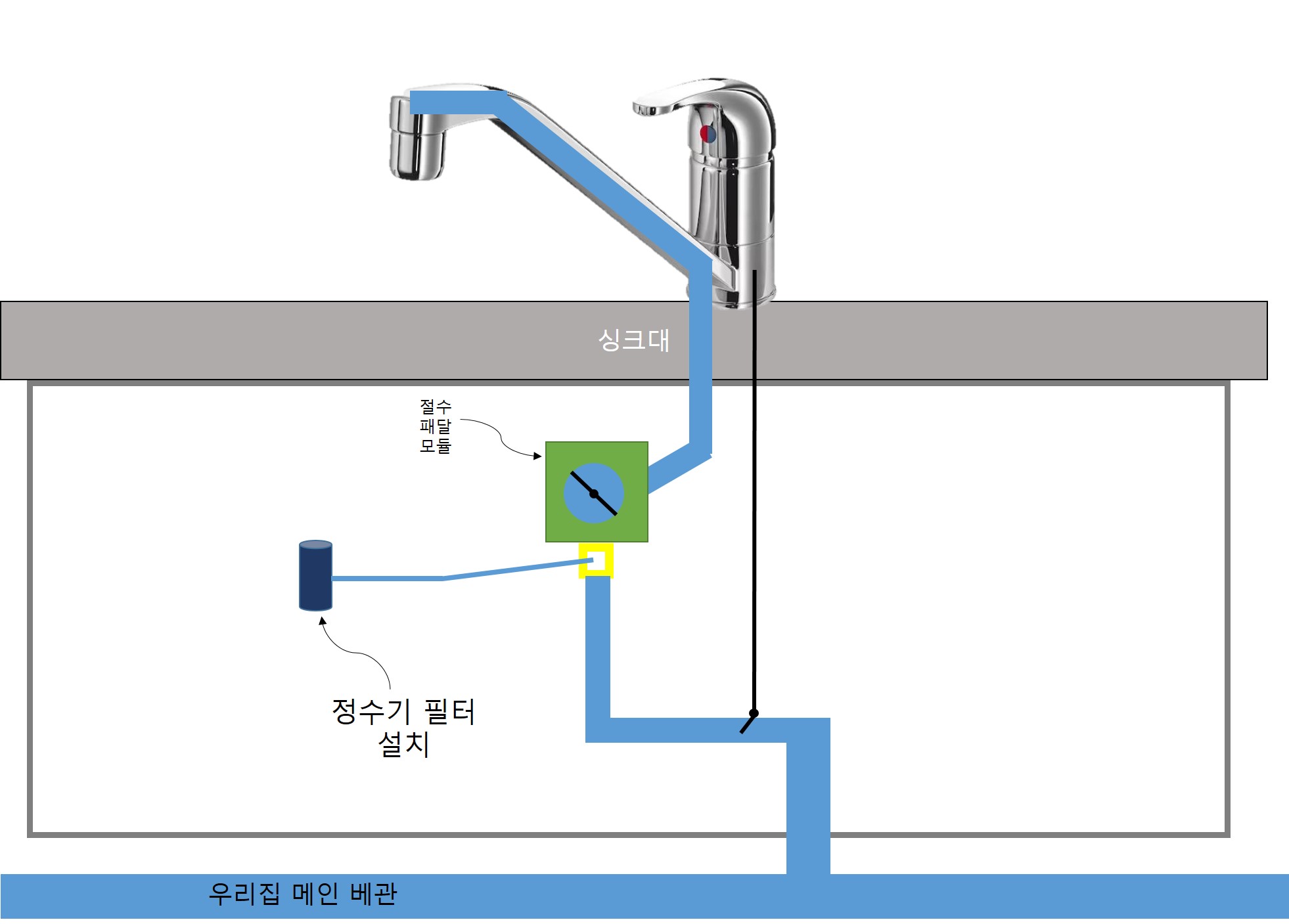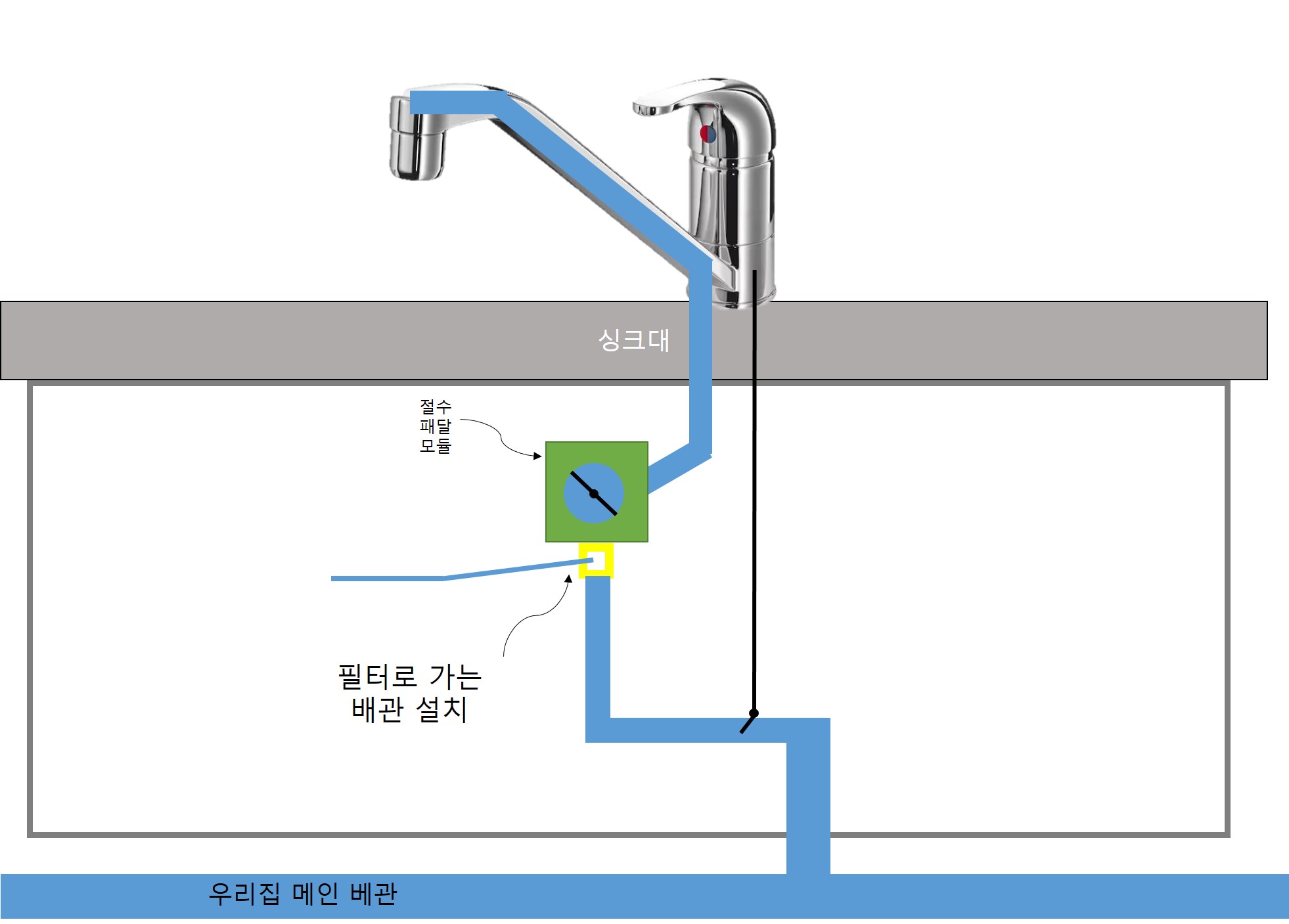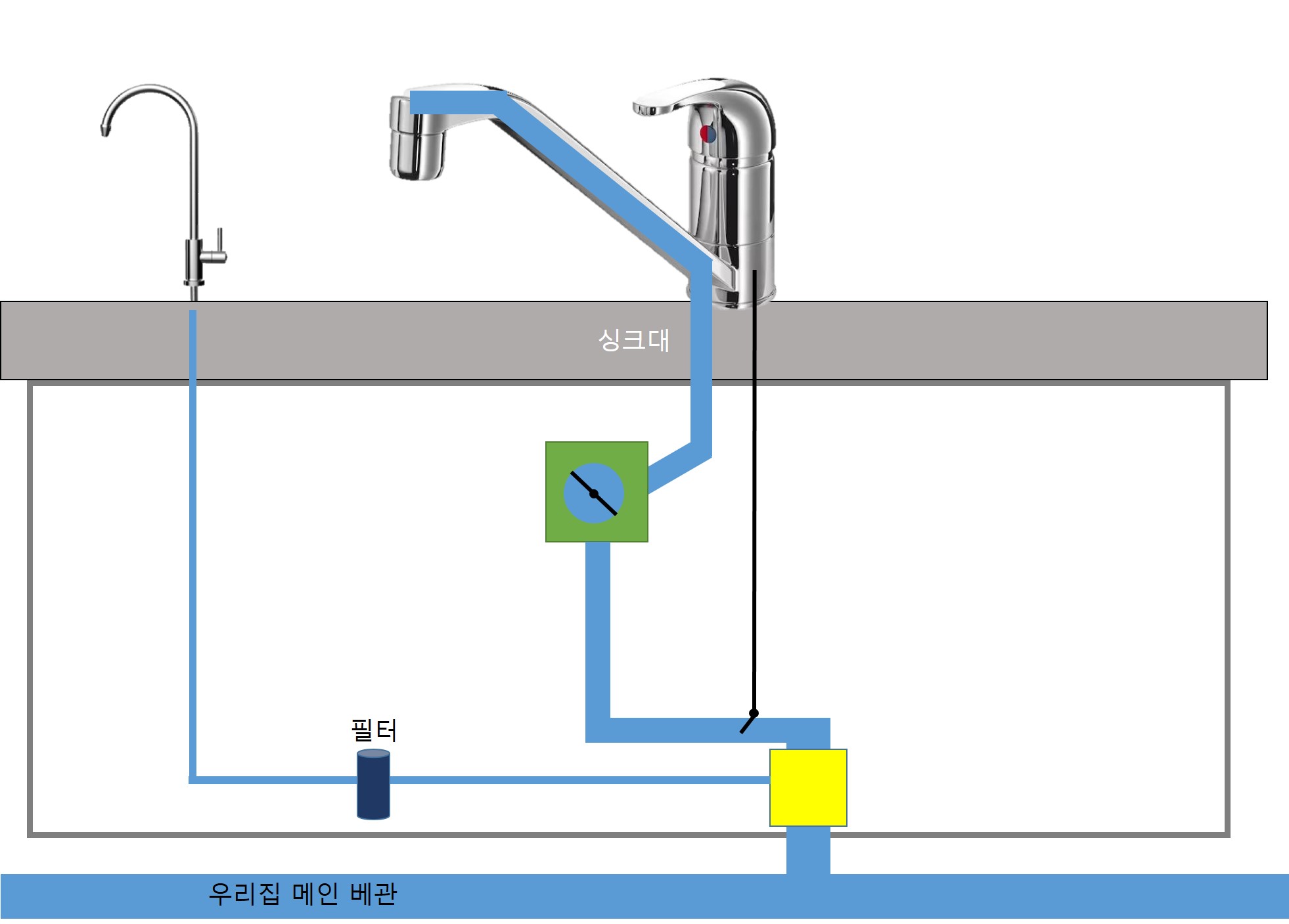 2) 그림 상에 노랑색 박스가 어댑터라는 부품이다. 어댑터가 설치 될 공간이 싱크대 아래에 있는지 확인해야한다