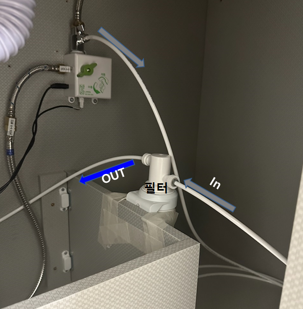 7) 필터를 적절한 위치에 설치하고,어댑터에서 오는 배관을 필터 in에 , 필터에서 나가는 배관을 정수기 수전에 연결