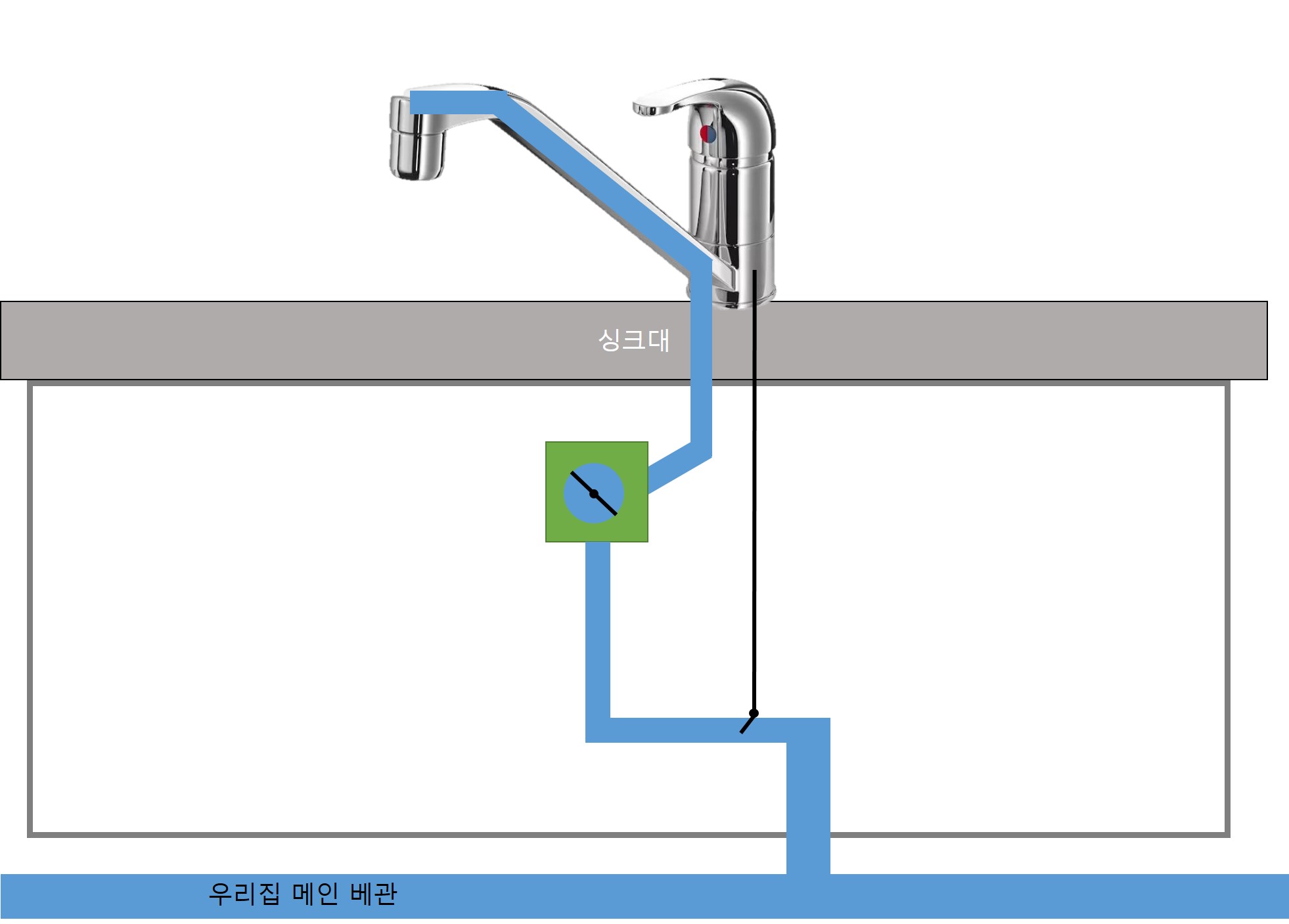 이 차이점에서 오는 현상이 하나 있는데, 그것은 바로 싱크대 수전을 개방 해야만 정수기 물이 나온다는 것이다.